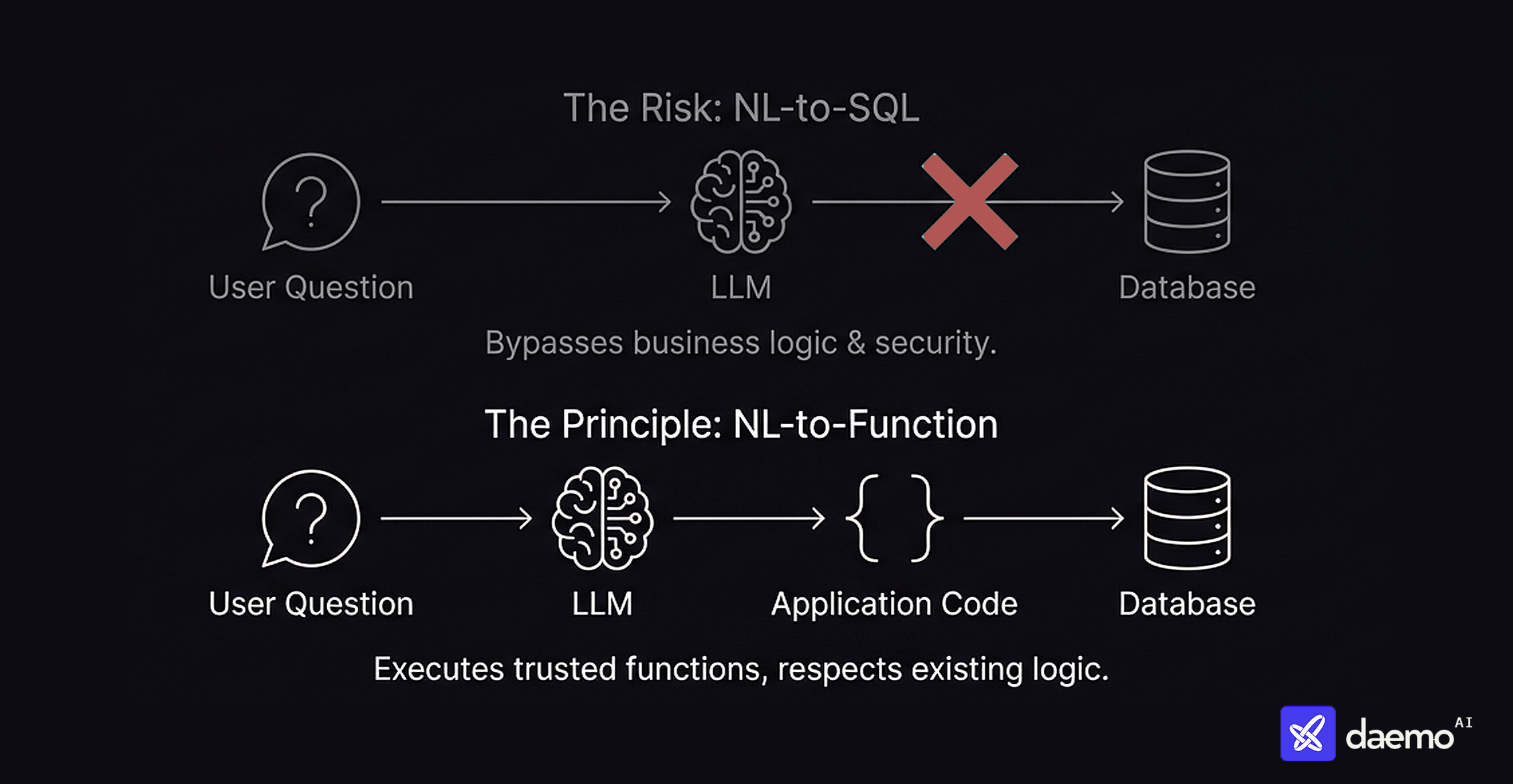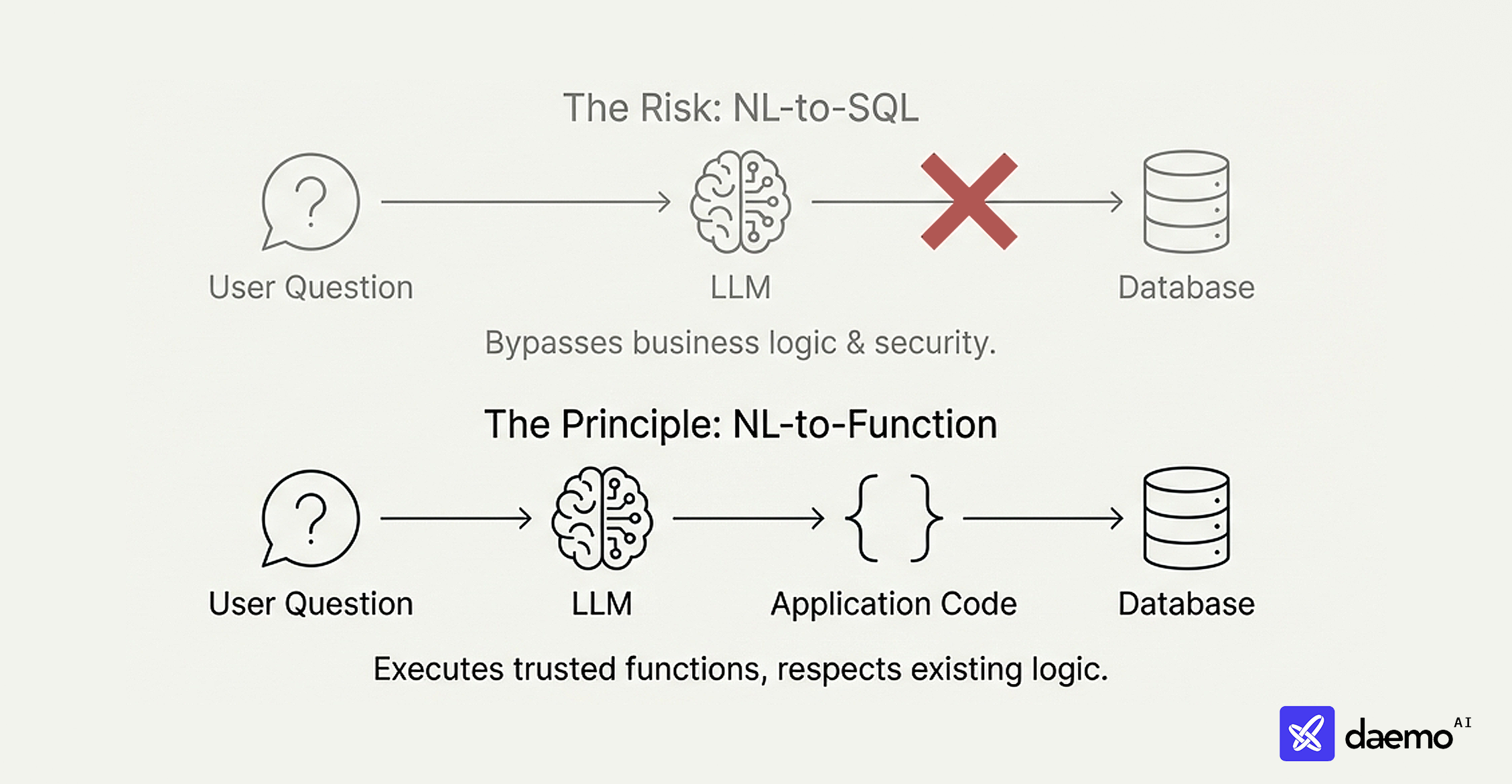 Connecting LLMs directly to a database (NL-to-SQL) is a security nightmare. It bypasses business logic, ignores application-layer permissions, and is prone to hallucinated queries that can corrupt or expose data.