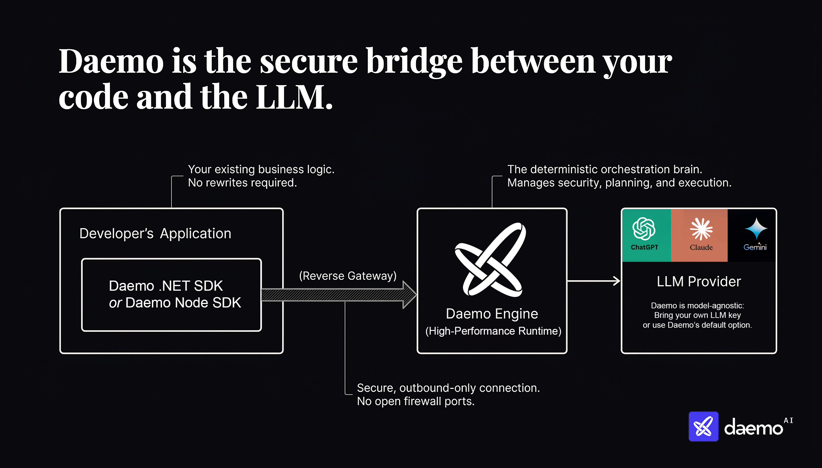 - Native Integration: Daemo drops into your existing .NET or Node.js app as a standard SDK dependency.