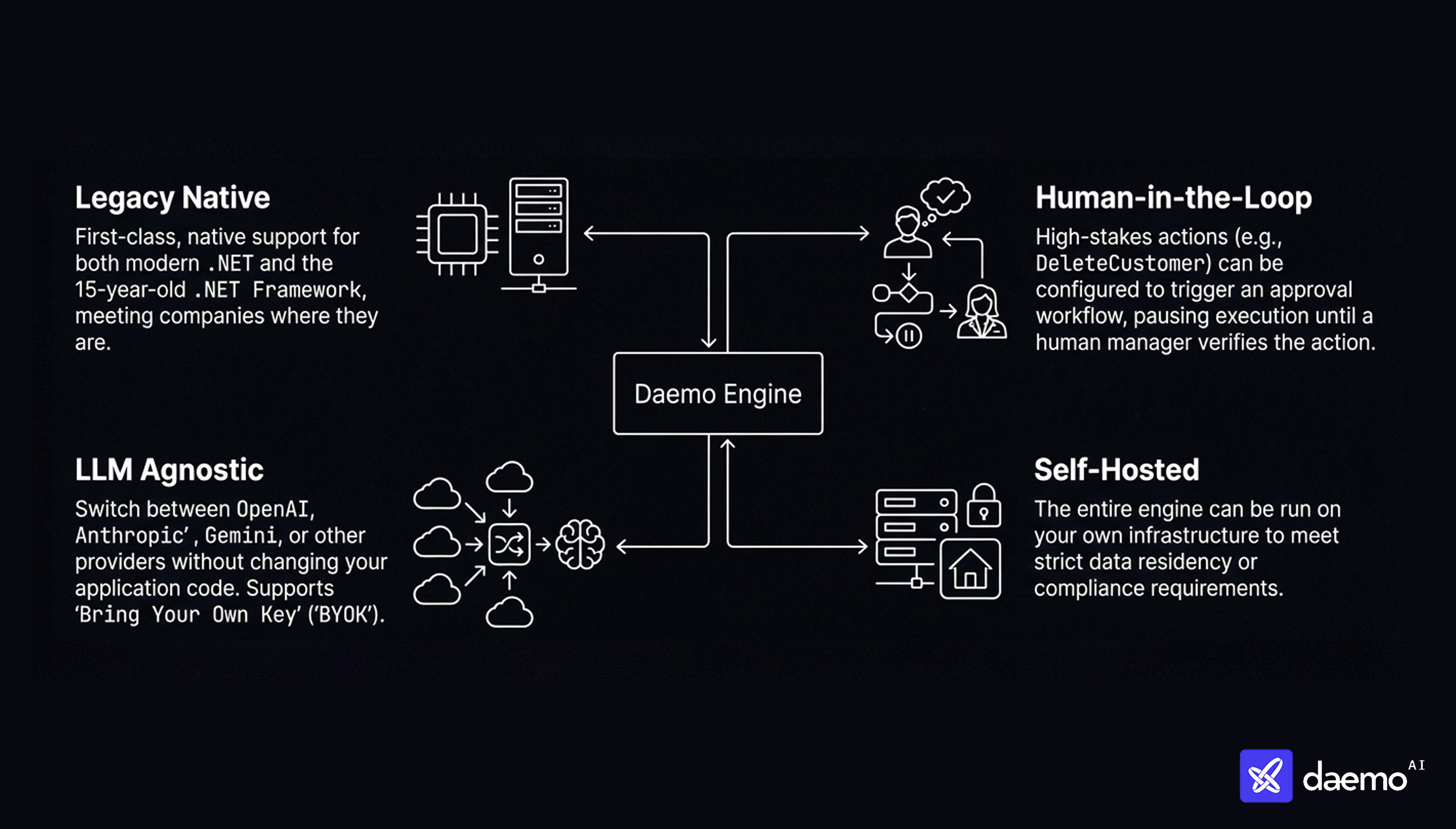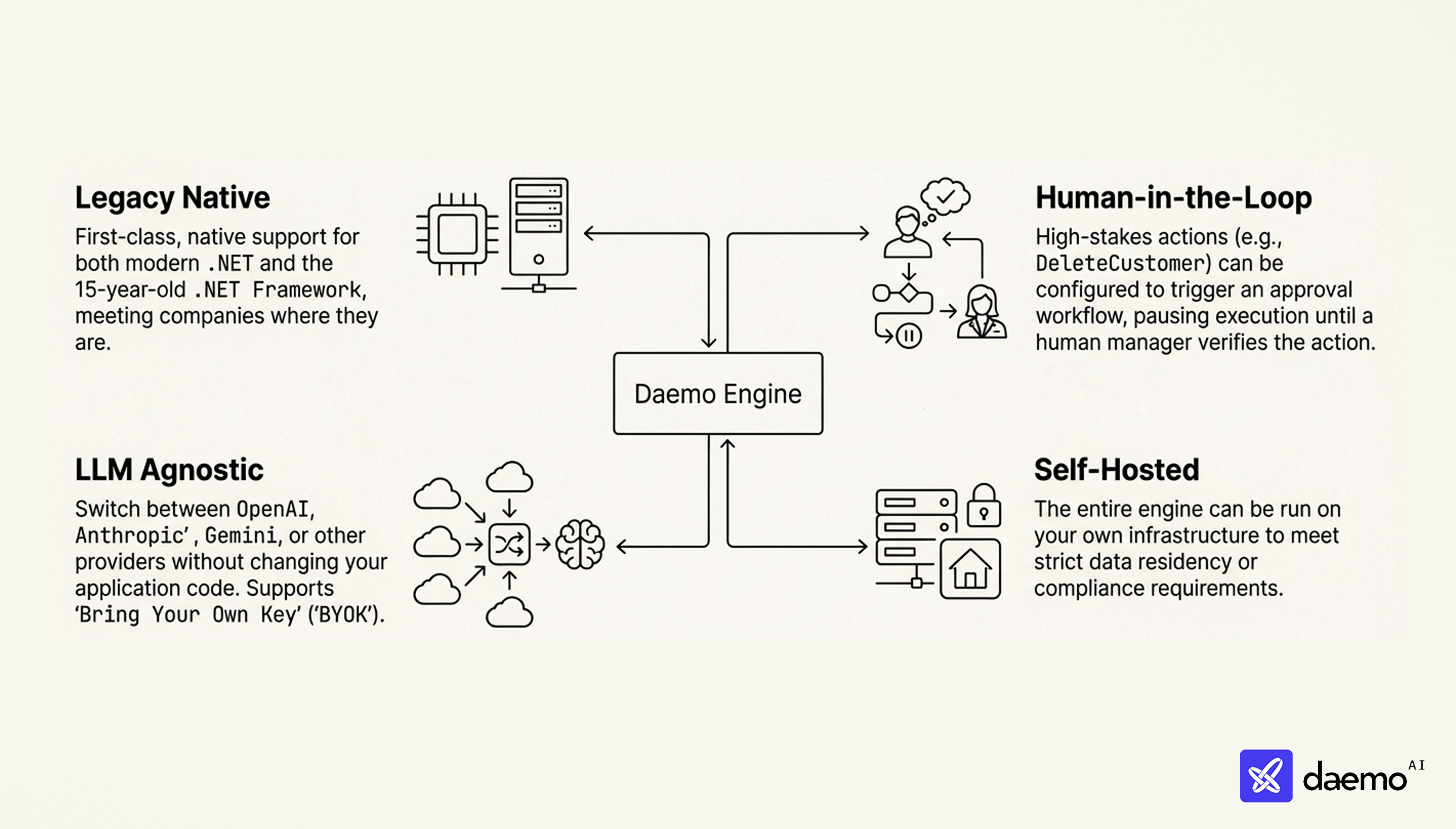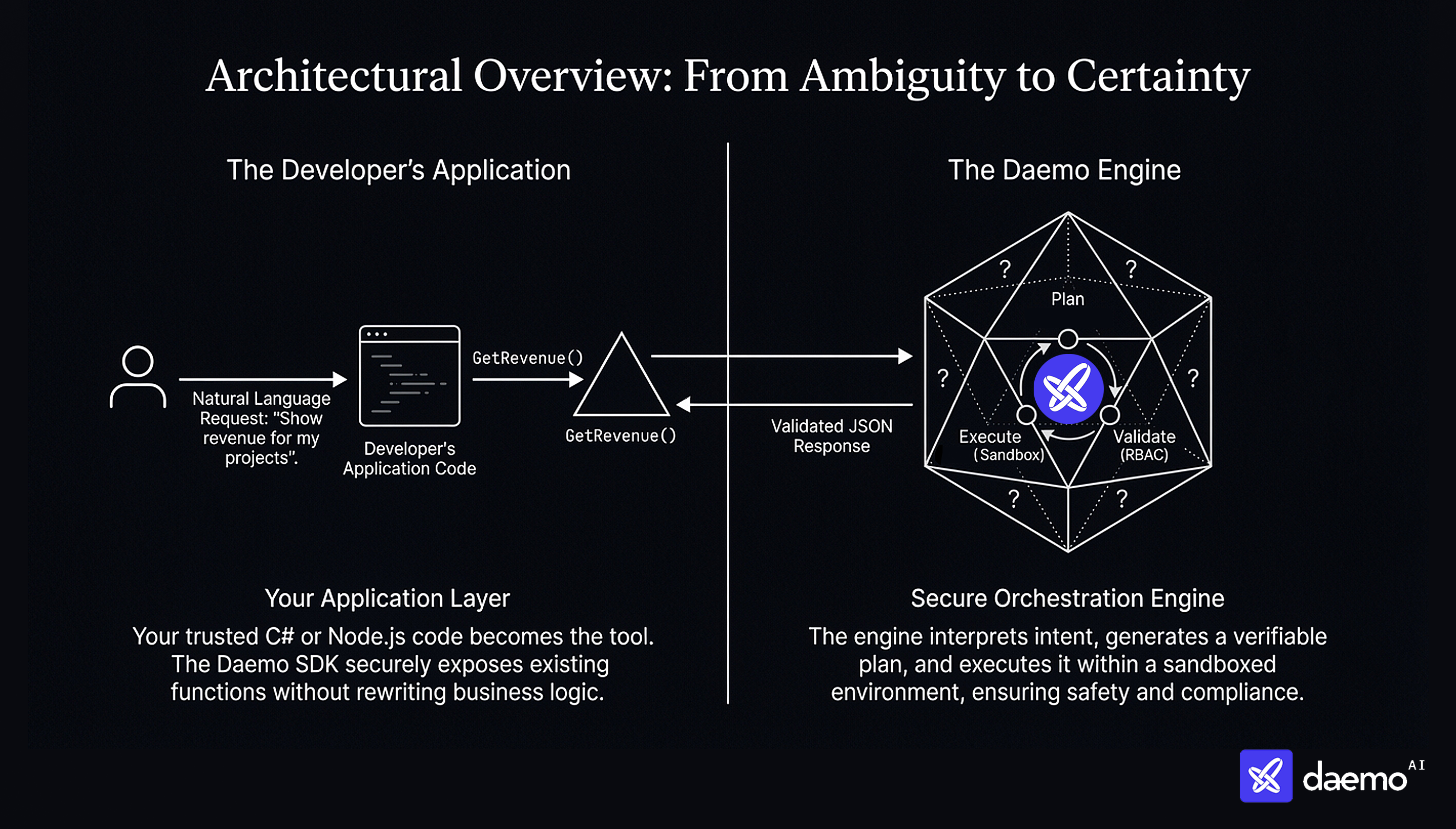 Daemo is NL-to-Function. It calls your C# or TypeScript methods, ensuring that every action goes through your existing validation, logging, and security checks.
