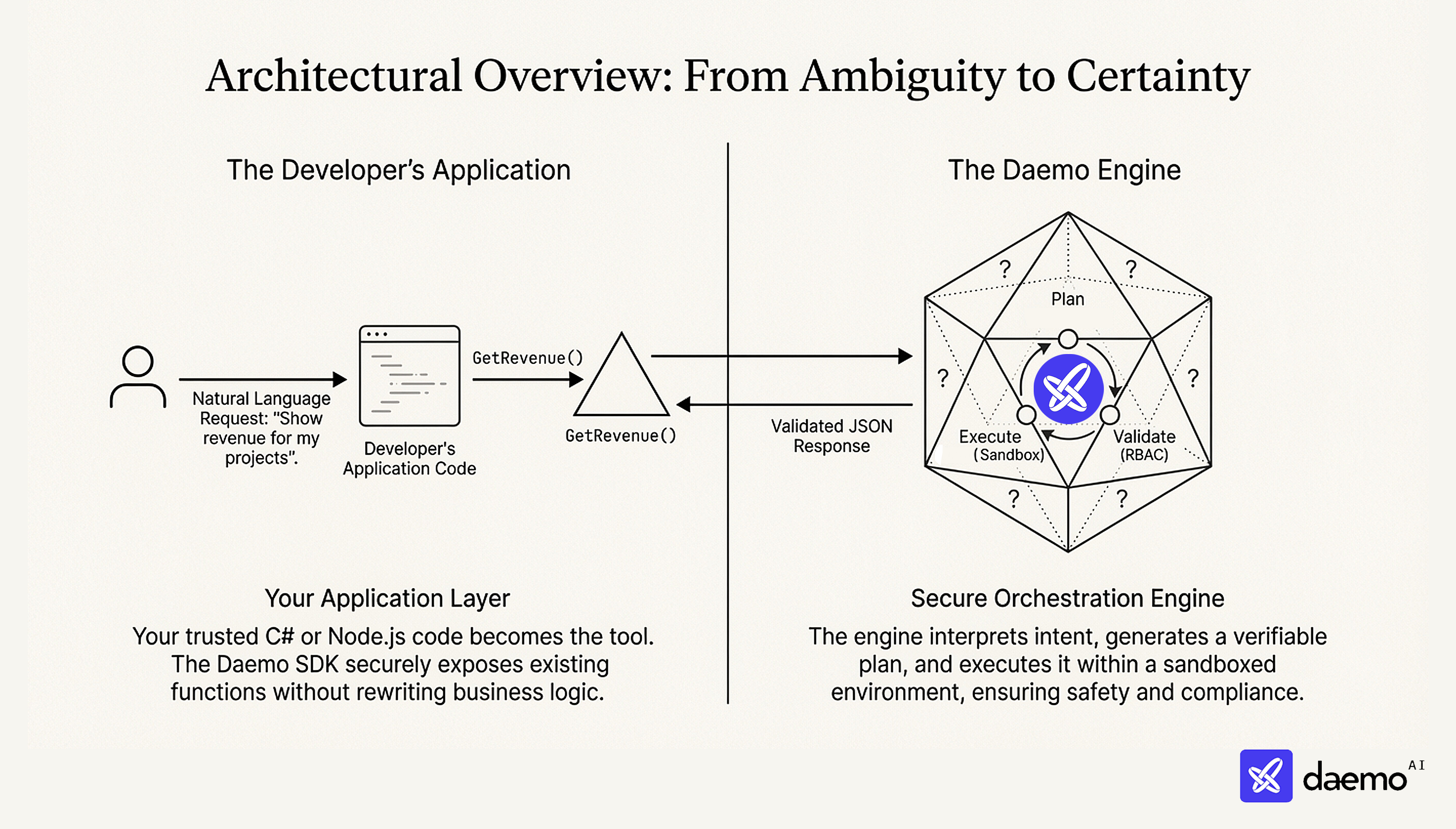 - Daemo (NL-to-Function): The AI requests data by calling your functions (e.g.,