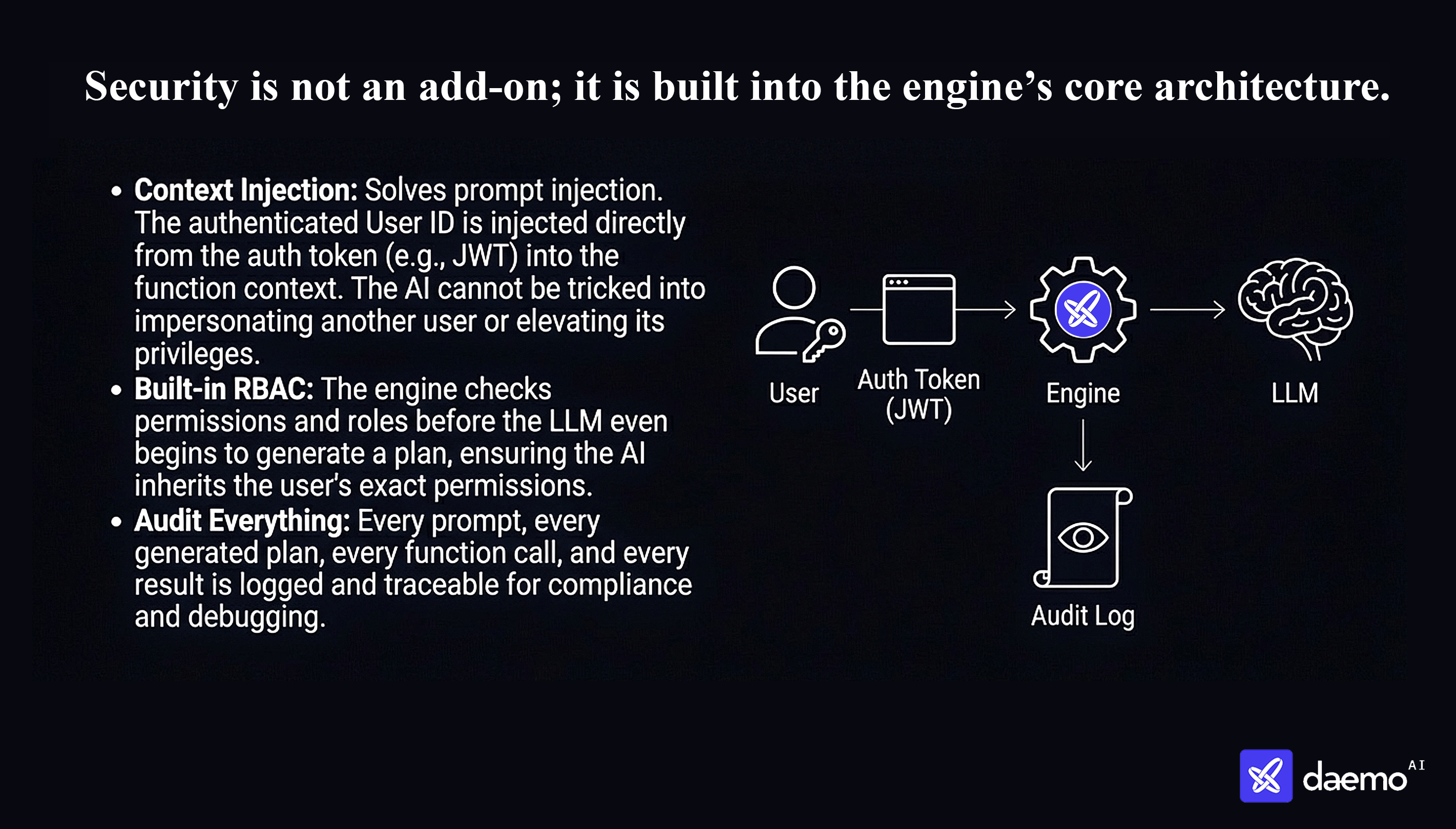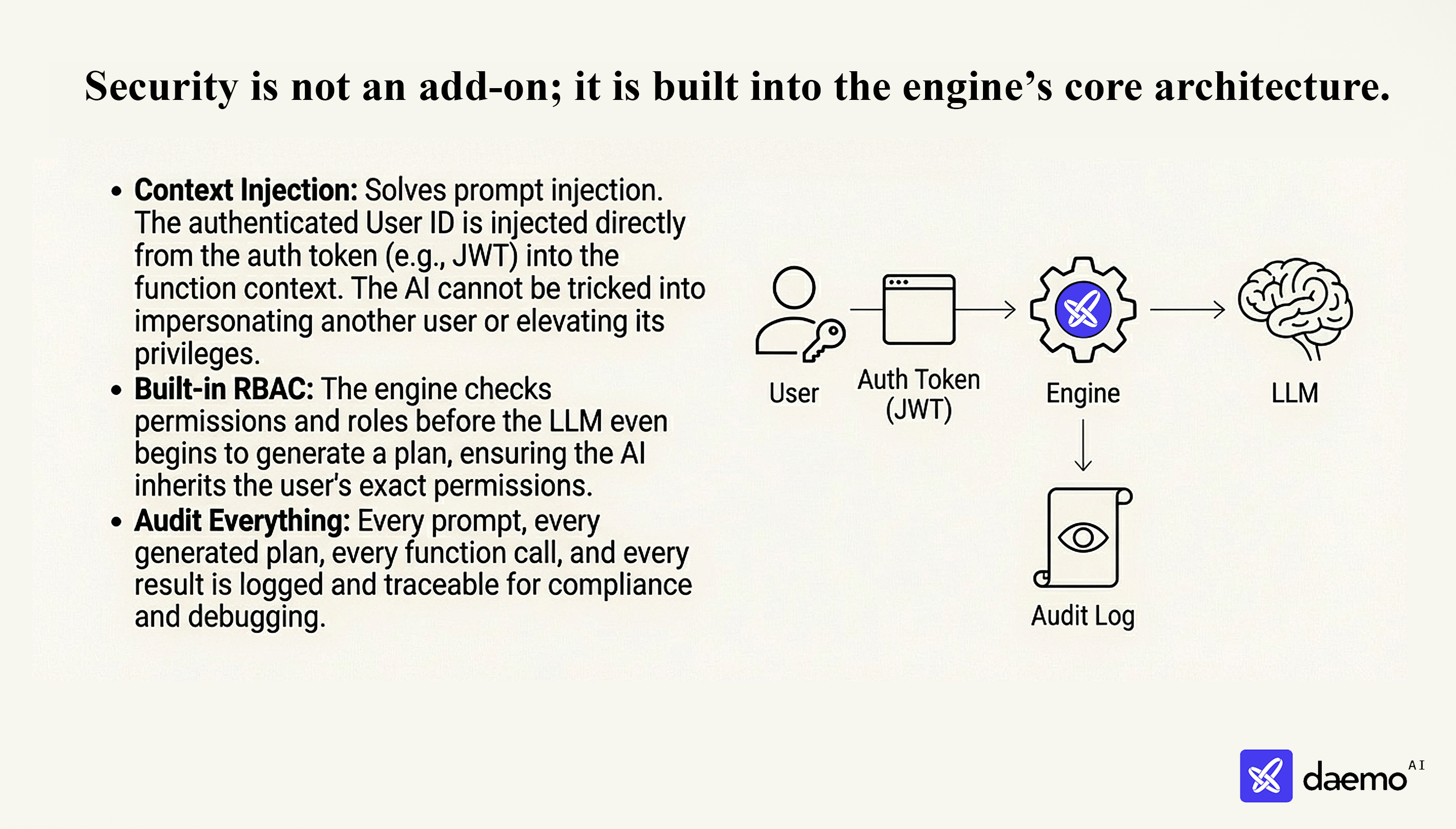 GetUser(123)). The engine runs your code, fetches only that specific record, and returns it to the AI. - Role-Based Access Control (RBAC): Since Daemo calls your code, it inherits your existing permission logic. If a user can't access a record in your app, they can't access it through Daemo—no risk of data leakage.